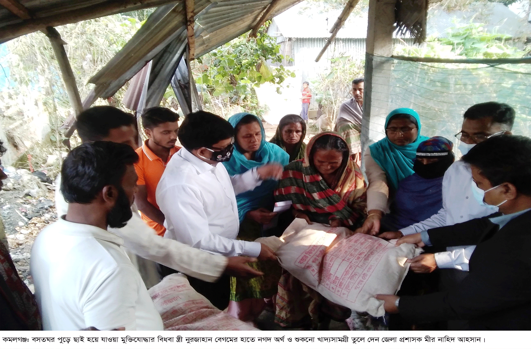মৌলভীবাজারের কমলগঞ্জ উপজেলার শমশেরনগর ইউনিয়নের ভাদাইর দেউল গ্রামে ছেলে হারানোর ১৩দিনের মাথায় আগুনে মুক্তিযোদ্ধার বিধবা স্ত্রী নুরজাহান বেগমের বসতঘর পুড়ে ছাই হয়ে যায়। গত ৩ ফেব্রুয়ারি বিধবা নারী নুরজাহানের একমাত্র উপার্জনক্ষম ছেলে রং মিস্ত্রি নুর ইসলাম মোল্লা রোগভোগে মারা যায়। আর ১৫ ফেব্রুয়ারি সন্ধ্যা রাতে তার বসত ঘর পুড়ে ছাই হয়ে যায়। এতে প্রায় ৩ লক্ষাধিক টাকার ক্ষতি সাধন হয়। ঘটনার পর থেকে খোলা আকাশের নিচে ছিলেন বিধবা নারী নুরজাহান বেগম। এ ধরণের মানবিক প্রতিবেদন বৃহস্পতিবার বিভিন্ন গণমাধ্যমে প্রকাশ হলে মৌলভীবাজারের জেলা প্রশাসক মীর নাহিদ আহাসন কমলগঞ্জের উপজেলা নির্বাহী কর্মকর্তা আশেকুল হককে সাথে নিয়ে নিজে এসে আর্থিক ও খাদ্য সহায়তা প্রদান করলেন ঘরপুড়া নারীকে।