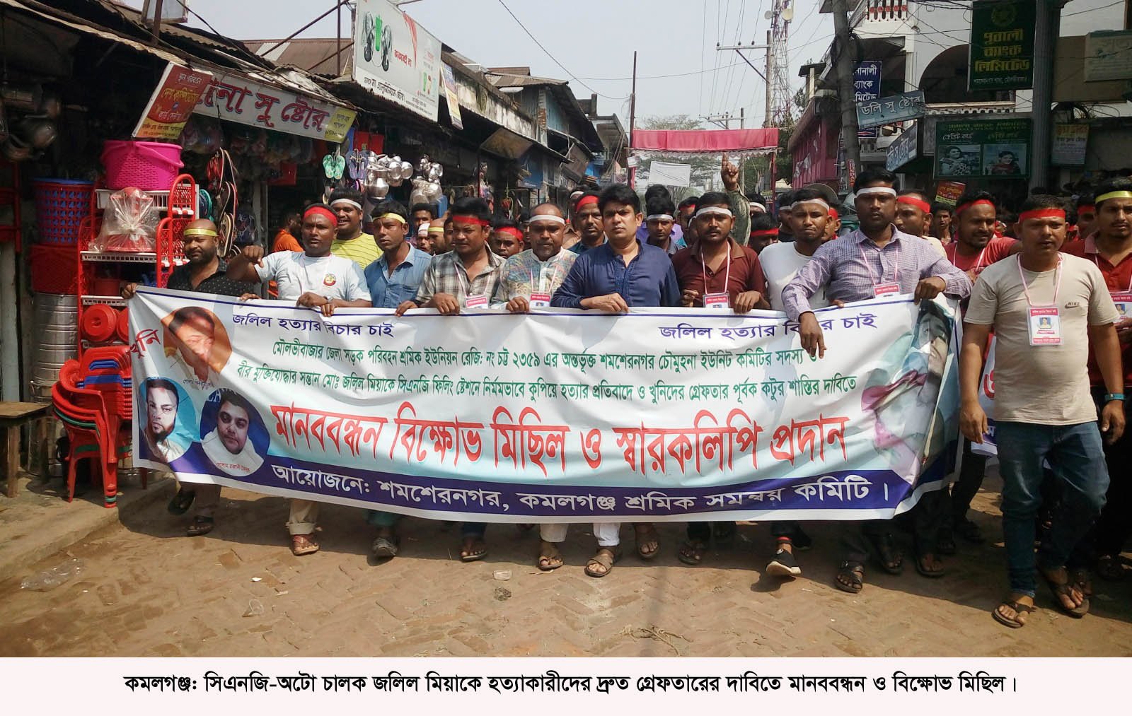 কমলকন্ঠ ডেস্ক ।। মৌলভীবাজারের কমলগঞ্জ উপজেলার শমশেরনগর ইউনিয়নের বড়চেগ সিএনজি ফিলিং স্টেশন এলাকায় তুচ্ছ ঘটনাকে কেন্দ্র করে প্রকাশ্যে সিএনজি-অটো চালক জলিল মিয়া (২৬) কে ছুুরিকাঘাতে হত্যার ঘটনায় আসামীদের দ্রুত গ্রেফতারের দাবিতে শমশেরনগর চৌমুহনায় সহস্রাধিক সিএনজি-অটো চালক ও পরিবহন শ্রমিকরা প্রায় তিন ঘন্টা সড়ক অবরোধ করে বিক্ষোভ মিছিল, সমাবেশ ও মানববন্ধন করেছে।