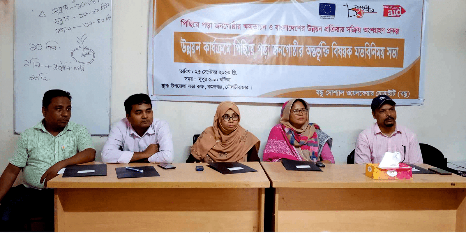 মৌলভীবাজারের কমলগঞ্জে পিছিয়ে পড়া জনগোষ্ঠীর ক্ষমতায়ন ও বাংলাদেশের উন্নয়ন প্রক্রিয়ায় সক্রিয় অংশগ্রহণ প্রকল্পের আওতায় উন্নয়ন কার্যক্রমে পিছিয়ে পড়া জনগোষ্ঠীর অন্তর্ভুক্তি বিষয়ক এক মতবিনিময় সভা অনুষ্ঠিত হয়েছে।