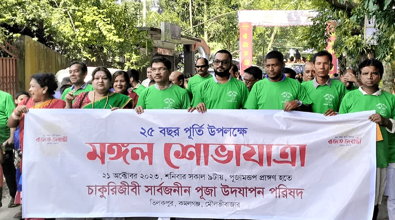 কমলগঞ্জে উপজেলার চাকুরীজীবি সার্বজনীন পূজা উদযাপন পরিষদের ২৫ বছর পূর্তি উপলক্ষে মঙ্গল শোভাযাত্রা ও রজতজয়ন্তী প্রকাশনা‘ অন্তর মম বিকশিত করো’ বইয়ের মোড়ক উন্মোচন করা হয়েছে।