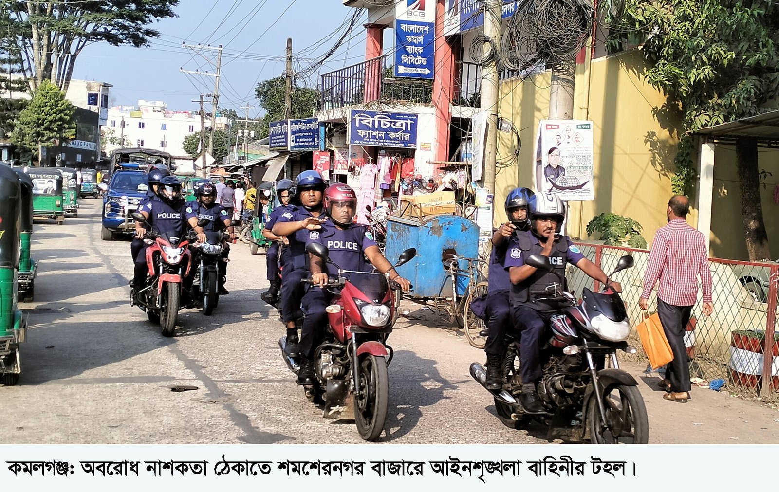 রোববার ৫ নভেম্বর বিকেলে মৌলভীবাজারের পুলিশ সুপার মোঃ মনজুর রহমান পিপিএম (বার) এর নের্তৃত্বে উর্ধ্বতন পুলিশ কর্মকর্তা, কমলগঞ্জ থানার ওসি সঞ্জয় চক্রবর্তী, শমশেরনগর পুলিশ ফাঁড়ির ইনচার্জ ওসি (তদন্ত) শামীম আকনজীসহ আইনশৃঙ্খলা রক্ষাকারী বাহিনীদেরকে শমশেরনগর ও কমলগঞ্জ উপজেলা সদরে টহলে দেখা যায়।