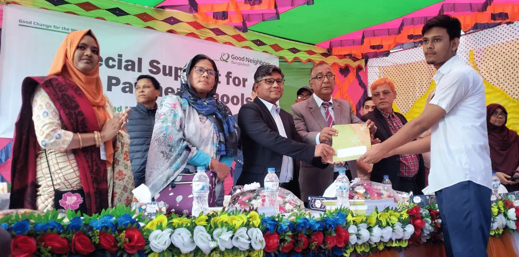 গুড নেইবারস্ বাংলাদেশ এর কান্ট্রি ডিরেক্টর এম. মাঈনুদ্দীন মাইনুলের সভাপতিত্বে ও একে বাংলা স্কুলের প্রধান শিক্ষক আনিসুজ্জামান মিজান এবং শিক্ষিকা মাহিমা আক্তার মুক্তার যৌথ পরিচালনায় অনুষ্ঠানে প্রধান অতিথি ছিলেন কমলগঞ্জ উপজেলা পরিষদের চেয়ারম্যান বীর মুক্তিযোদ্ধা আলহাজ্ব অধ্যাপক মো. রফিকুর রহমান। বিশেষ অতিথি হিসেবে উপস্থিত ছিলেন উপজেলা পরিষদের ভাইস চেয়ারম্যান বিলকিস বেগম, আদমপুর ইউপি চেয়ারম্যান আবদাল হোসেন, উপজেলা মাধ্যমিক শিক্ষা অফিসার সামছুন নাহার পারভীন, উপজেলা মহিলা বিষয়ক কর্মকর্তা হোসনে আরা তালুকদার, উপজেলা পরিবার পরিকল্পনা কর্মকর্তা রিপন চন্দ্র দাস, গুড নেইবারস বাংলাদেশ্ মৌলভীবাজার সিডিপির প্রকল্প ব্যবস্থাপক বিপুল রেমা প্রমুখ।