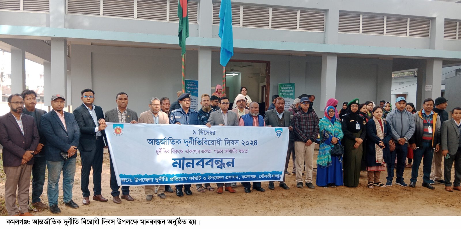 "দুর্নীতির বিরুদ্ধে তারুণ্যের একতা: গড়বে আগামীর শুদ্ধতা " এই প্রতিপাদ্যকে সামনে রেখে মৌলভীবাজারের কমলগঞ্জে আন্তর্জাতিক দুর্নীতি বিরোধী দিবস পালিত হয়েছে। এ উপলক্ষে সোমবার সকাল ১০টায় উপজেলা প্রশাসন ও উপজেলা দুর্নীতি প্রতিরোধ কমিটির উদ্যোগে জাতীয় সঙ্গীত পরিবেশন, জাতীয় পতাকা ও দুদক পতাকা উত্তোলন, মানববন্ধন এবং “দুর্নীতি দমন ও প্রতিরোধে করণীয়” শীর্ষক আলোচনা সভা অনুষ্ঠিত হয়।