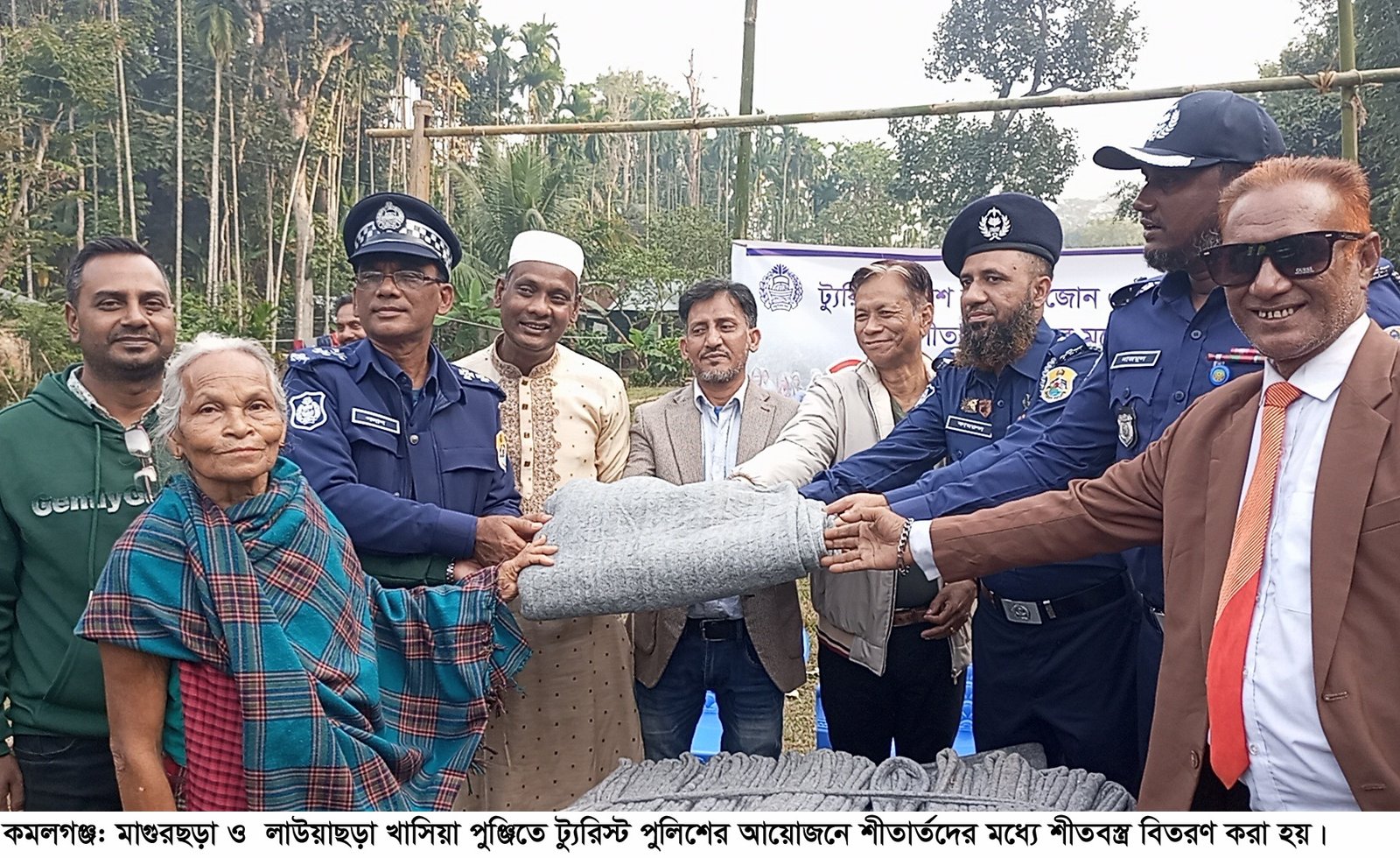কমলকন্ঠ ডেস্ক ।। মৌলভীবাজারের কমলগঞ্জে ট্যুরিস্ট পুলিশের আয়োজনে শীতার্তদের মধ্যে শীতবস্ত্র বিতরণ করা হয়েছে। বৃহস্পতিবার (১৯ ডিসেম্বর) বিকেলে কমলগঞ্জ উপজেলার মাগুরছড়া ও লাউয়াছড়া খাসিয়া পুঞ্জিতে বসবাসরত ক্ষুদ্র নৃতাত্বিক জনগোষ্ঠী শতাধিক পরিবারের মধ্যে শীতবস্ত্র (কম্বল) বিতরণ করা হয়।