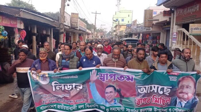 স্বাগত মিছিলে উপজেলা বিএনপির আহ্বায়ক অলি আহমেদ খান, যুগ্ম আহবায়ক মো: আবুল হোসেন, পৌর বিএনপির যুগ্ম আহবায়ক প্রত্যুষ ধরসহ উপজেলা যুবদল, ছাত্রদল, স্বেচ্ছাসেবক দল, কৃষক দল, শ্রমিক দল, তাঁতীদল, জাসাসসহ অঙ্গ ও সহযোগি সংগঠনের নেতৃবৃন্দ অংশ নেন।