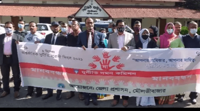 কমলকন্ঠ ডেস্ক ।। ‘আপনার অধিকার, আপনার দায়িত্ব: দুর্নীতিকে না বলুন’ এ প্রতিপাদ্য নিয়ে মৌলভীবাজারের জেলা প্রশাসন আয়োজনে আন্তর্জাতিক দুর্নীতি বিরোধী দিবস পালন করা হয়েছে। বৃহস্পতিবার (৯ ডিসেম্বর) সকাল ১১ টার