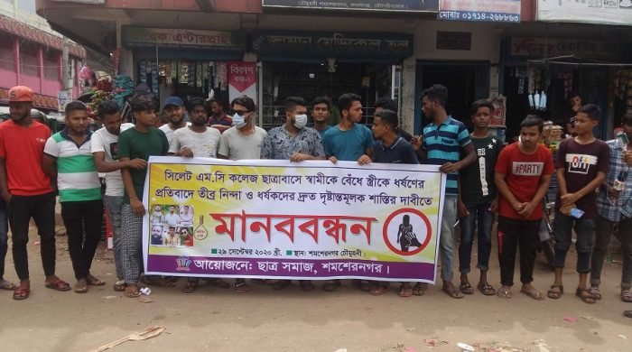 কমলকন্ঠ রিপোর্ট ।। সিলেটের ঐতিহ্যবাহী এমসি কলেজ ছাত্রাবাসে ধরে নিয়ে স্বামীকে বেঁধে রেখে তরুণী গৃহবধূকে গণ ধর্ষণকারীদের দৃষ্টান্তমূলক শাস্তির দাবি করে মৌলভীবাজারের কমলগঞ্জের শমশেরনগর চৌমুহনায় মানববন্ধন কর্মসূচি পালন করা হয়েছে।